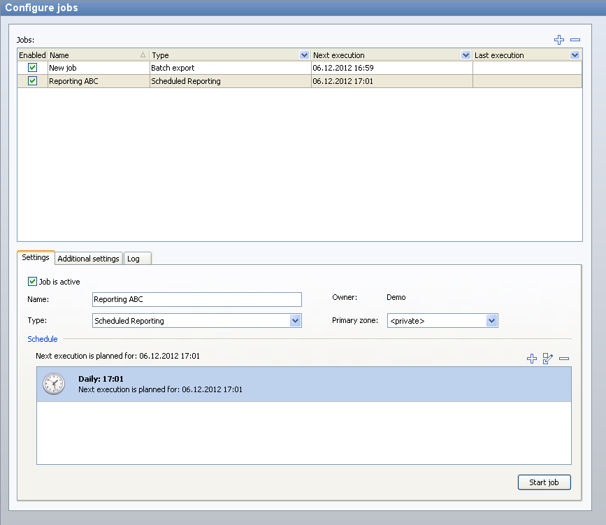 Designation | The freely selectable name of the job. Enter the name of a (newly created) job in the "Name" field at the bottom of the "Settings" mini-tab. |