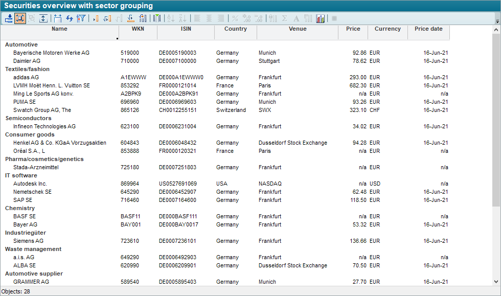 The evaluation provides a tabular display grouped by industry for the securities in a folder or filter.