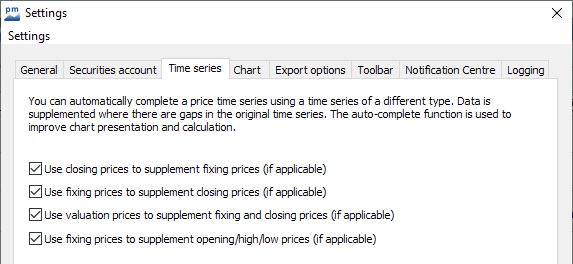 Price time series can be automatically supplemented by prices of a different price type (e.g. close prices by spot prices). The supplement is carried out if courses of the original course type are missing. This automatic addition improves the calculation and charting of price time series.