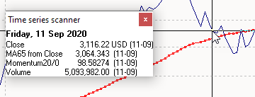 You can move the vertical scan line using the <ARROW LEFT> and <ARROW RIGHT> cursor keys. To scan the displayed time series(s). Each press of the button shifts the scan line by one unit of the set consolidation period in the desired direction, e.g. one day forwards or backwards when set to "daily".