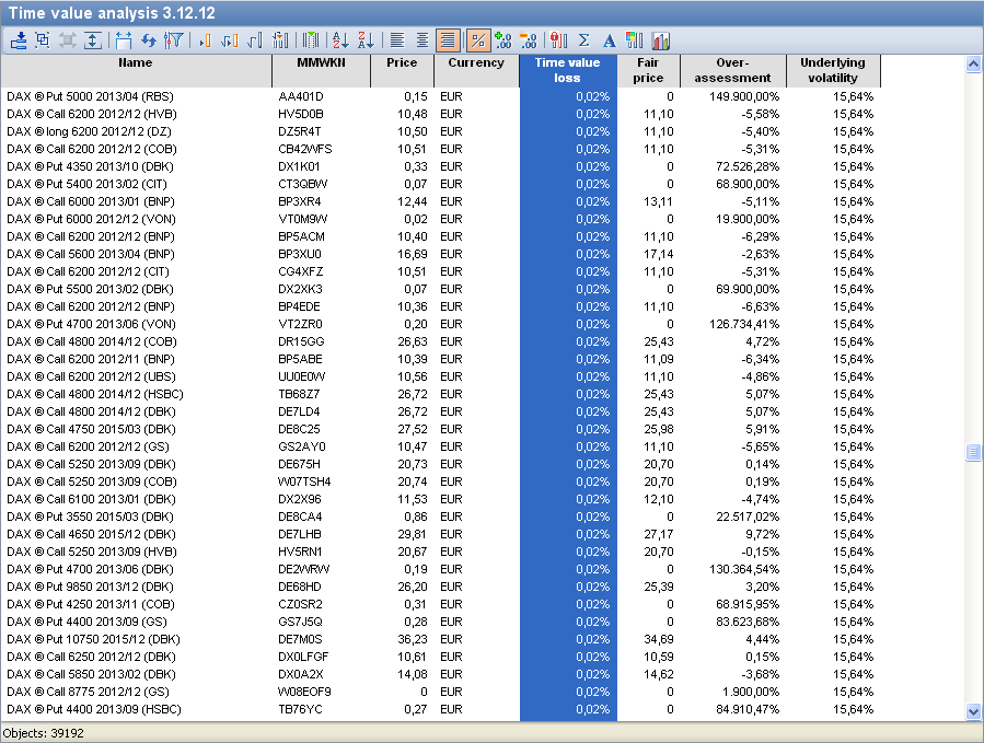 The time value analysis in the Infront Portfolio Manager provides you with a detailed evaluation of the time value loss. The evaluation shows the current price of the option in addition to the time value loss.