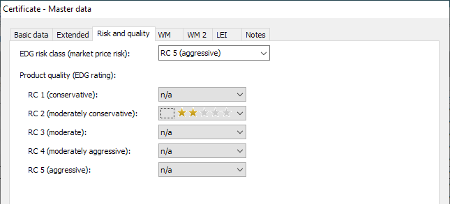 On the "Risk and quality" tab you will find the master data for the EDG certificate rating. Please read the section EDG certificate rating in the certificate master data.