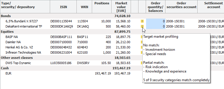 The target market profiling of the securities is also supported in portfolio rebalancing. In the upper key figure area of the portfolio rebalancing, you will find messages about the results of the profiling. Note icons also appear in the item overview.